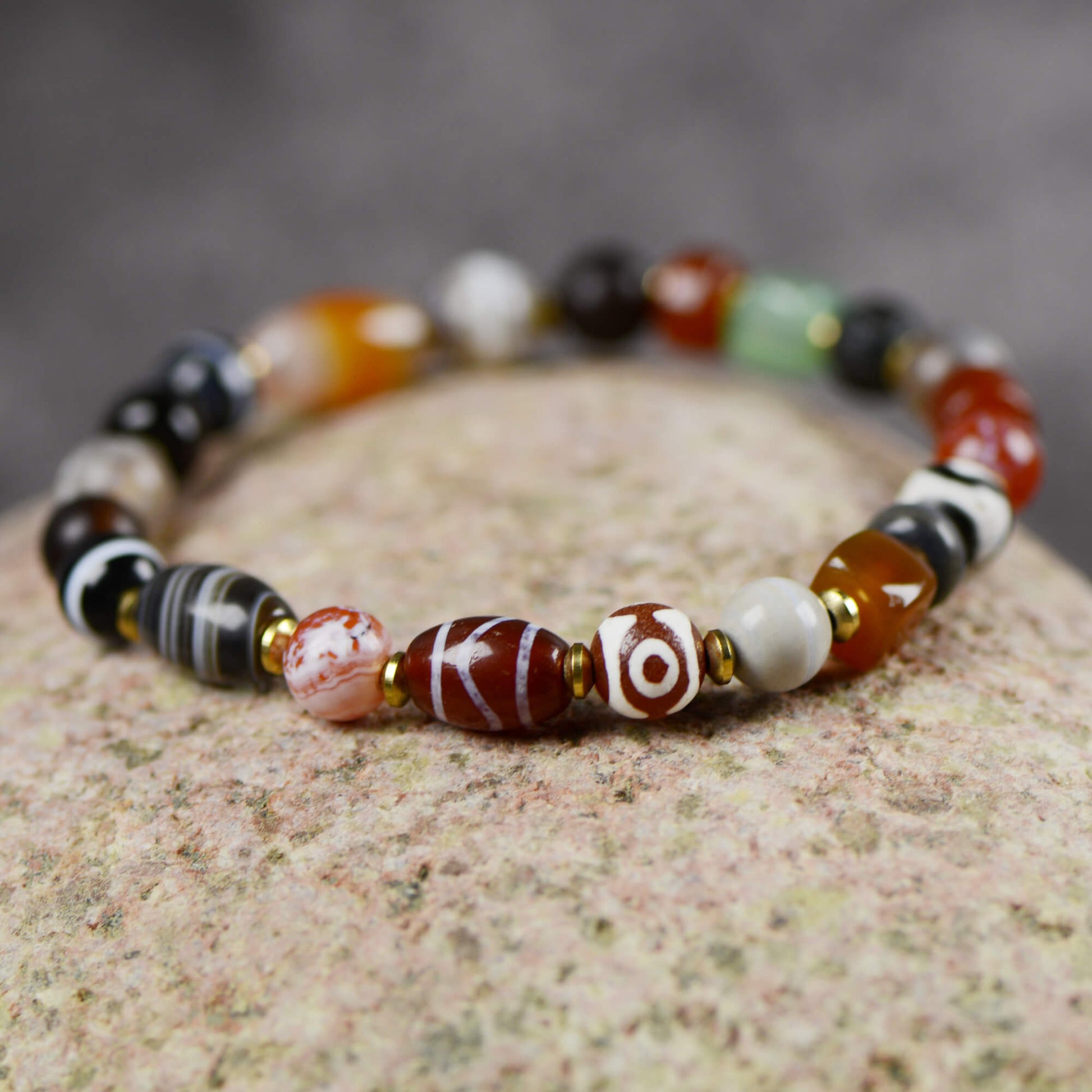 Rooted in Tibetan Buddhist tradition, each bracelet is handcrafted from natural agate, with no two ever alike. Agate carries a subtle magnetic field that aids meditation, calms the mind, and restores energy, serving as a guardian talisman that quiets the spirit and clears away distractions.