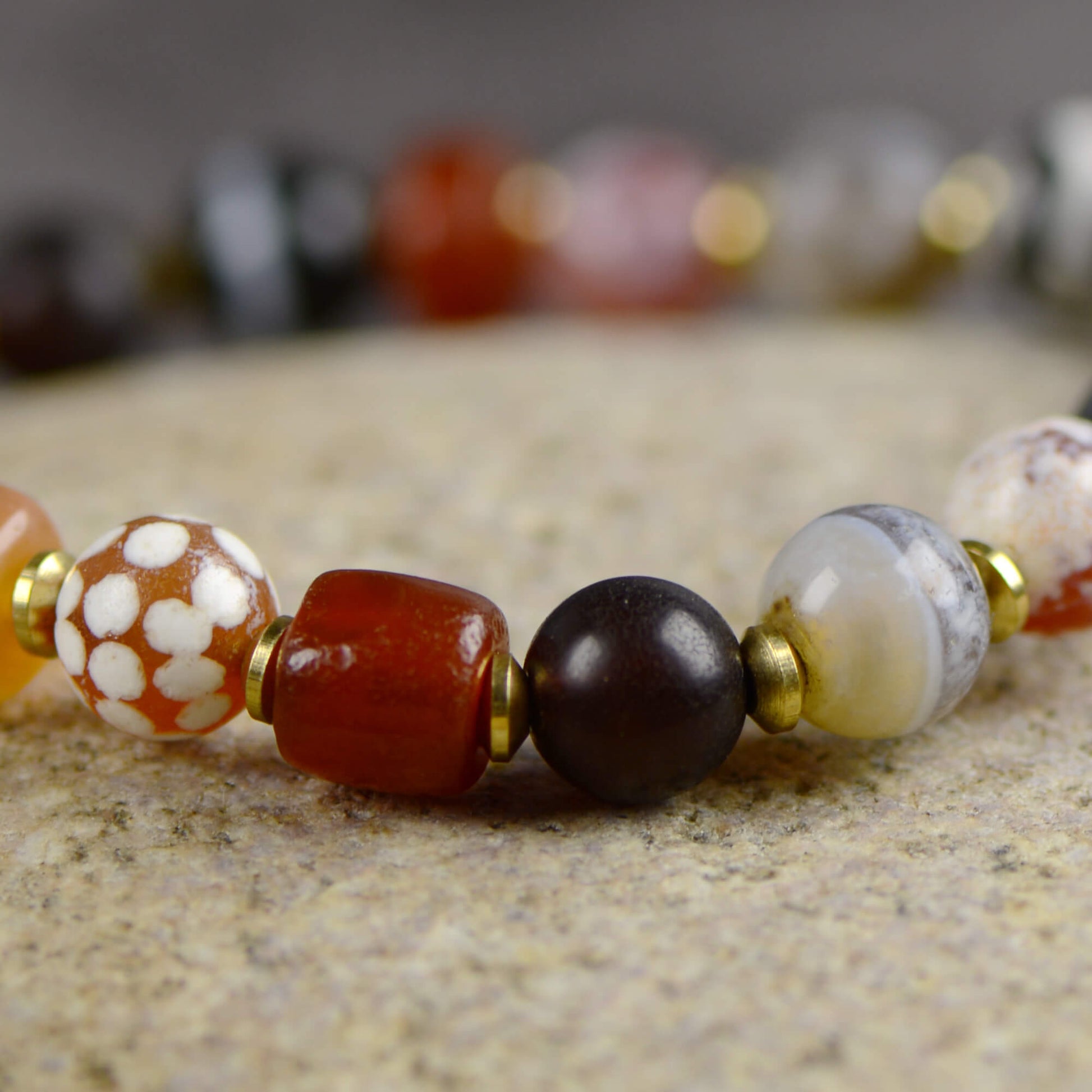 Agates of different colors meet along the strand, like the varied experiences of life connected into the wholeness of you. Handmade weaving and unrepeatable textures mirror the uniqueness of existence.