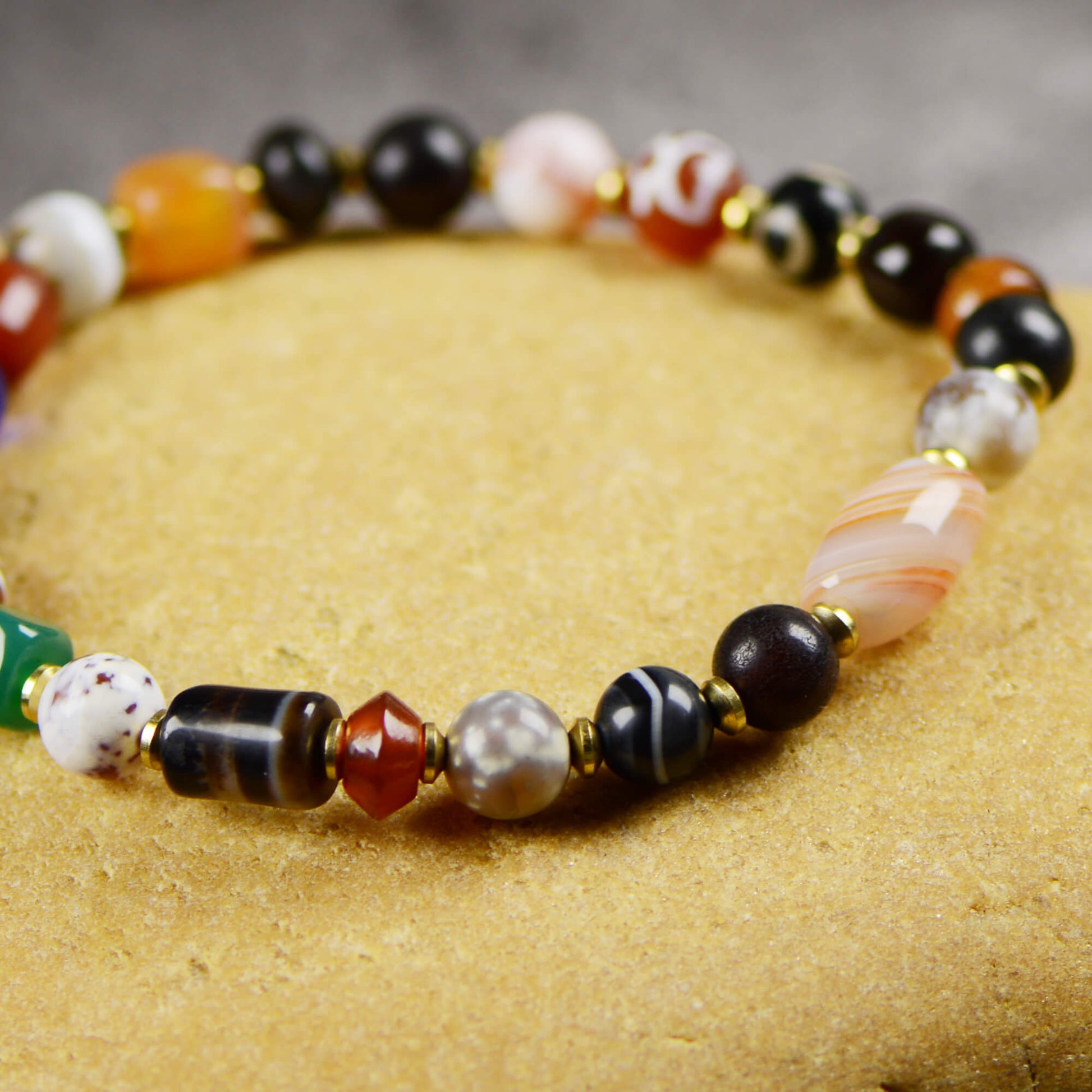 Rooted in Tibetan Buddhist tradition, each bracelet is handcrafted from natural agate, with no two ever alike. Agate carries a subtle magnetic field that aids meditation, calms the mind, and restores energy, serving as a guardian talisman that quiets the spirit and clears away distractions.