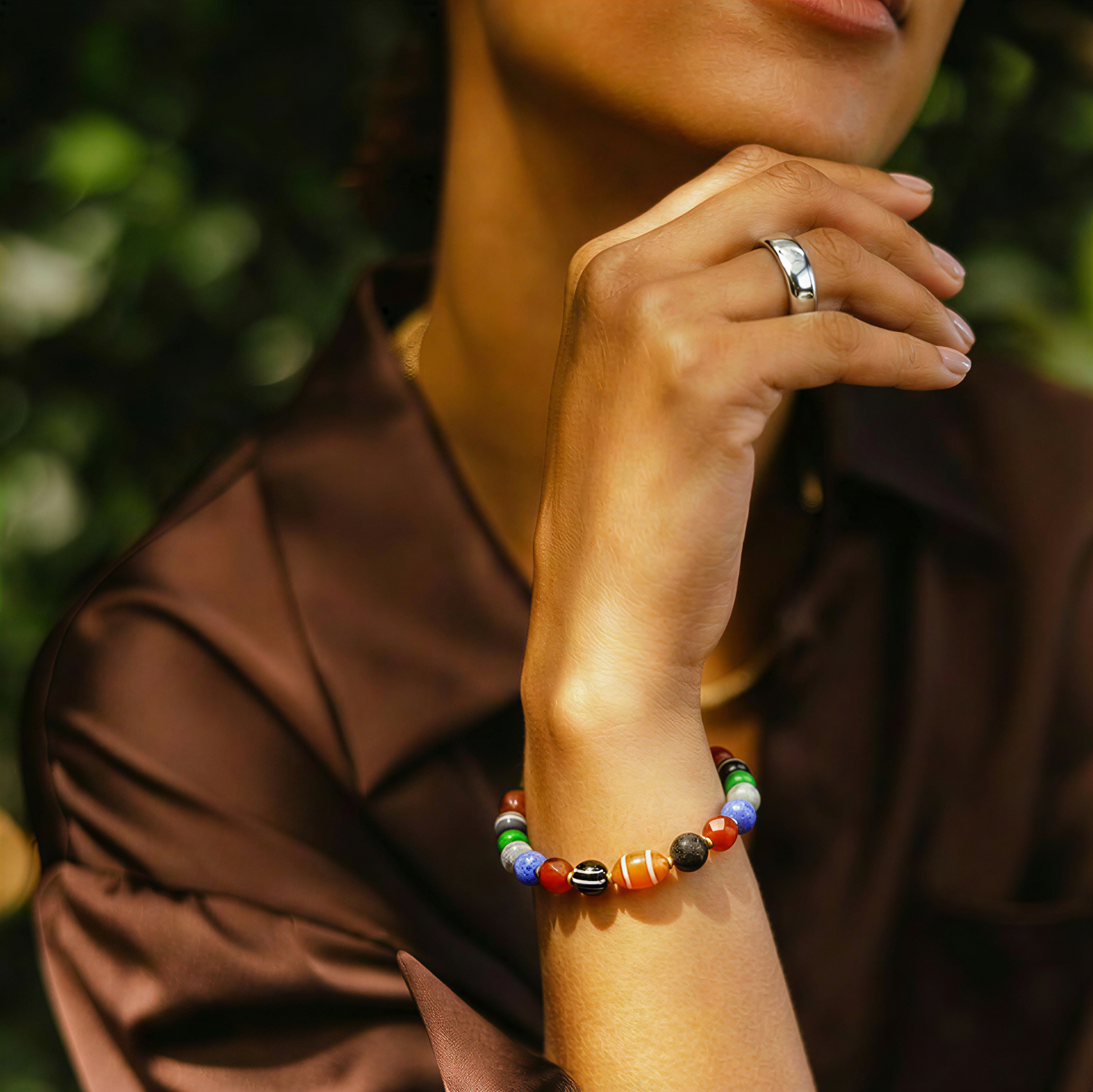 Rooted in Tibetan Buddhist tradition, each bracelet is handcrafted from natural agate, with no two ever alike. Agate carries a subtle magnetic field that aids meditation, calms the mind, and restores energy, serving as a guardian talisman that quiets the spirit and clears away distractions.