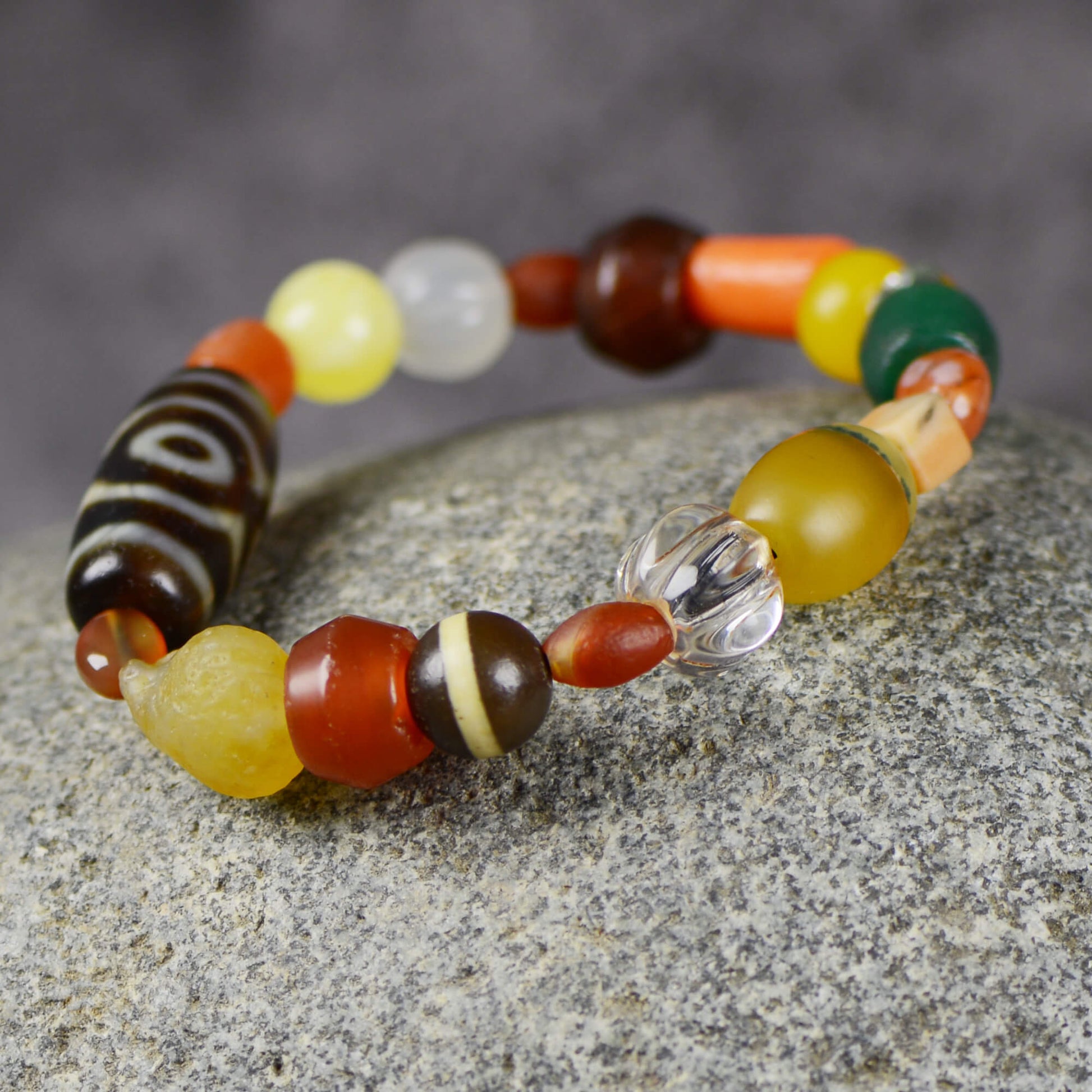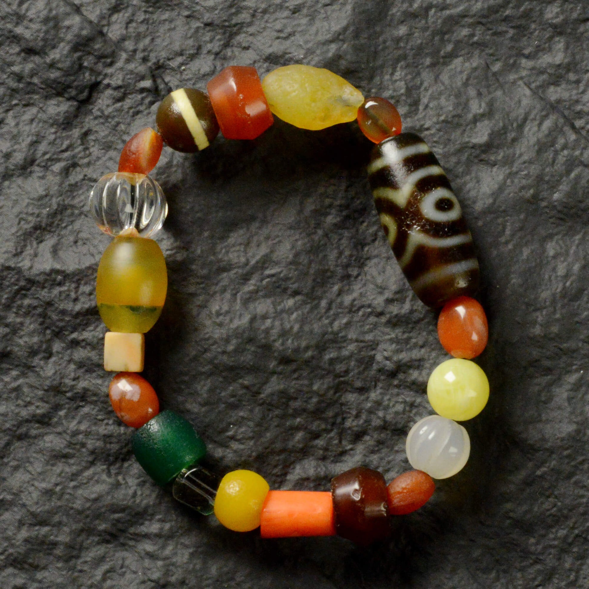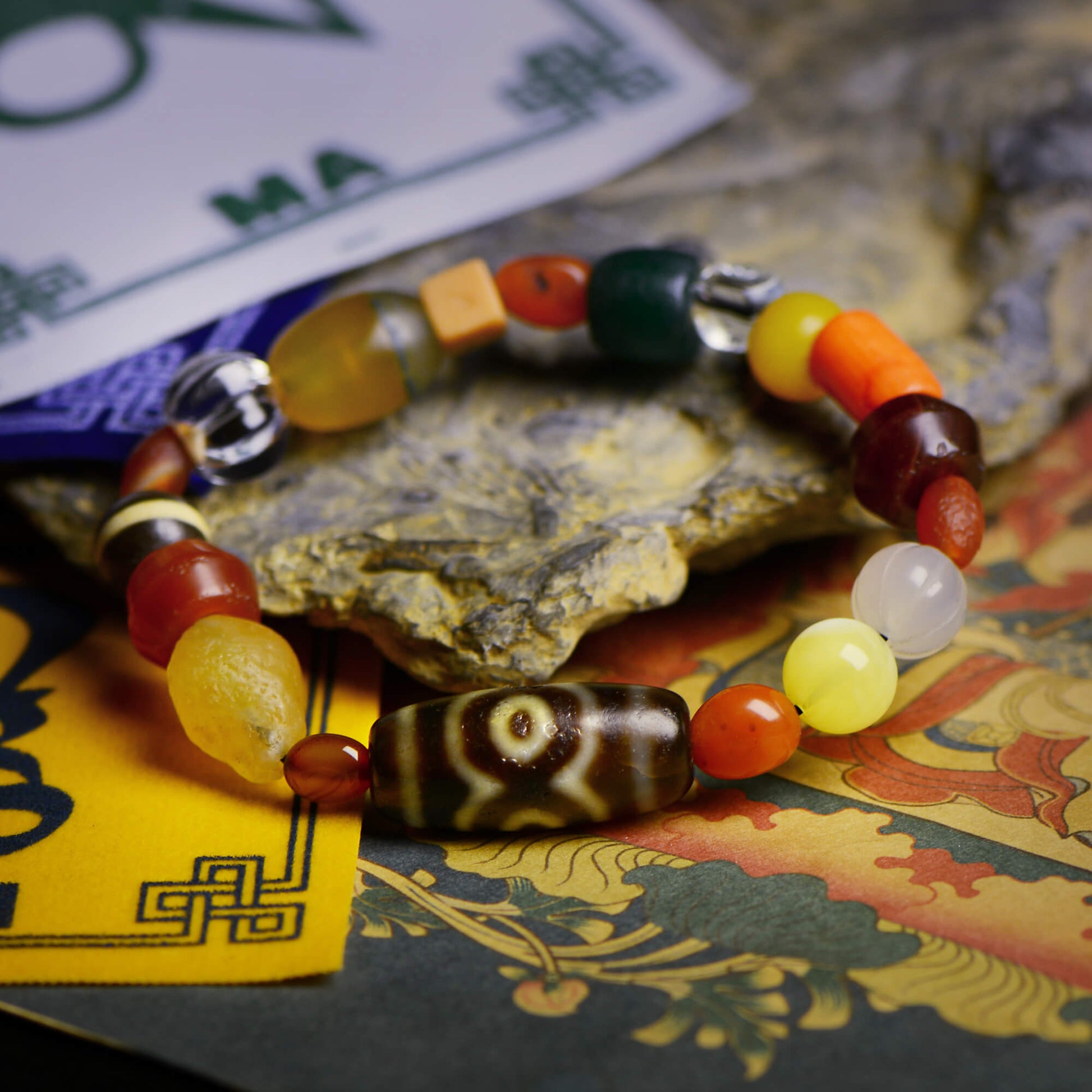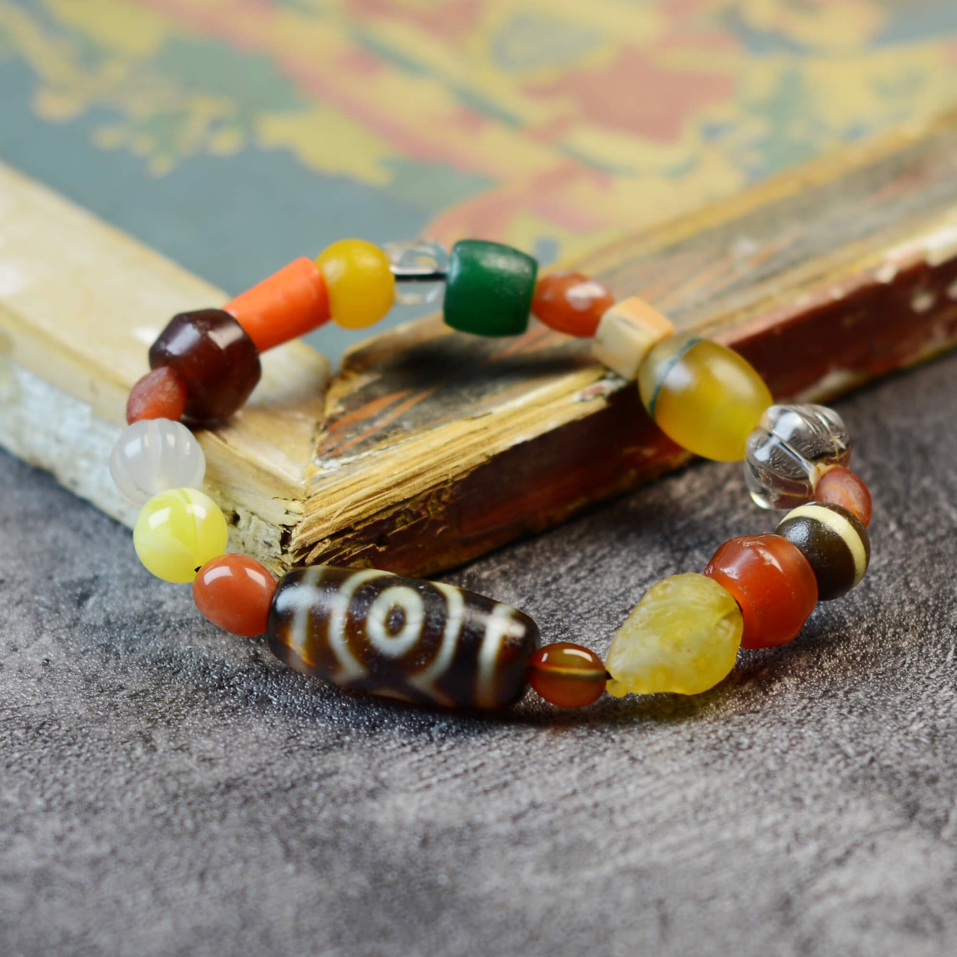 This Three-Eyed Dzi originates from Tibet, handcrafted with agates of different shapes and colors, giving it a unique style.
