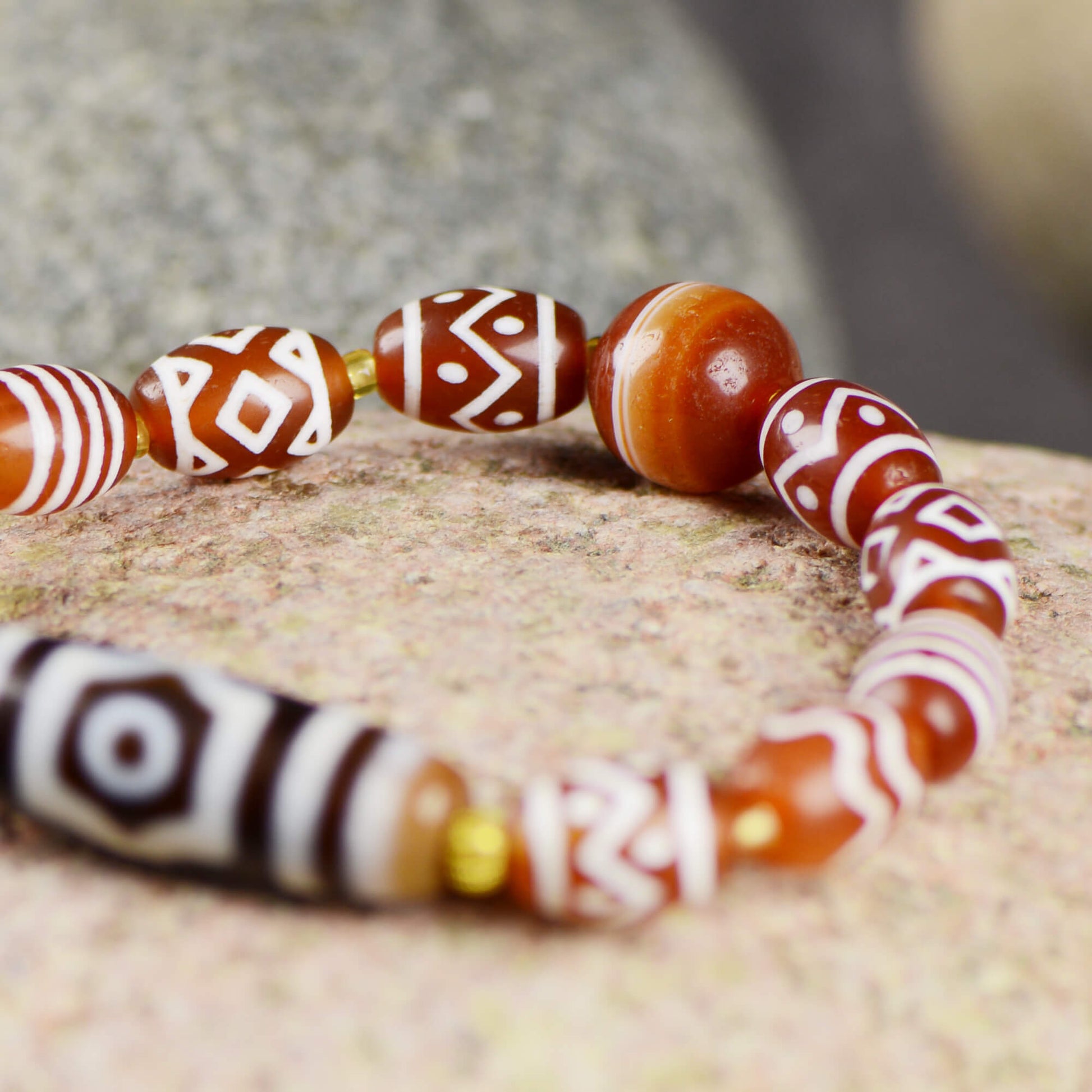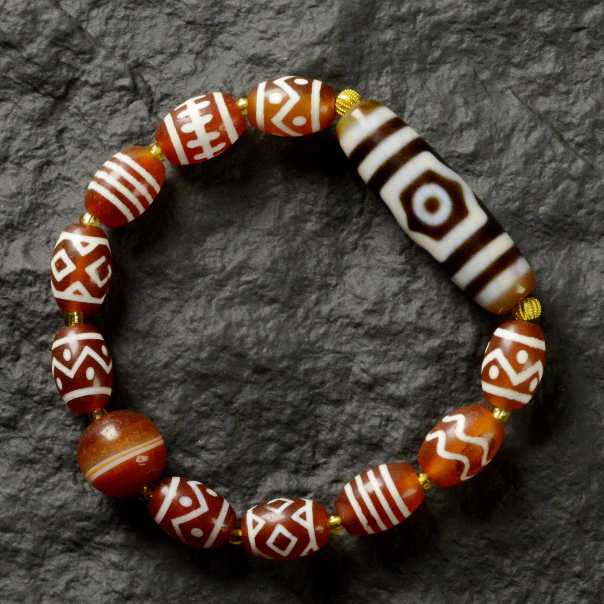 A unique Fire Agate Three-Eyed Dzi Bracelet, originating from Tibet.