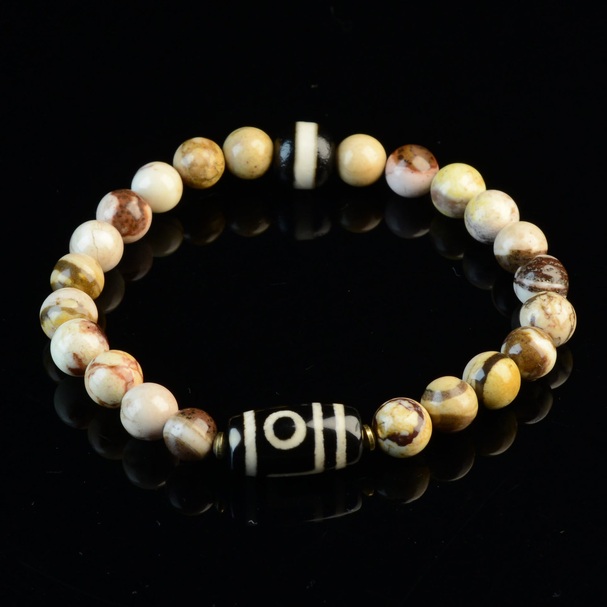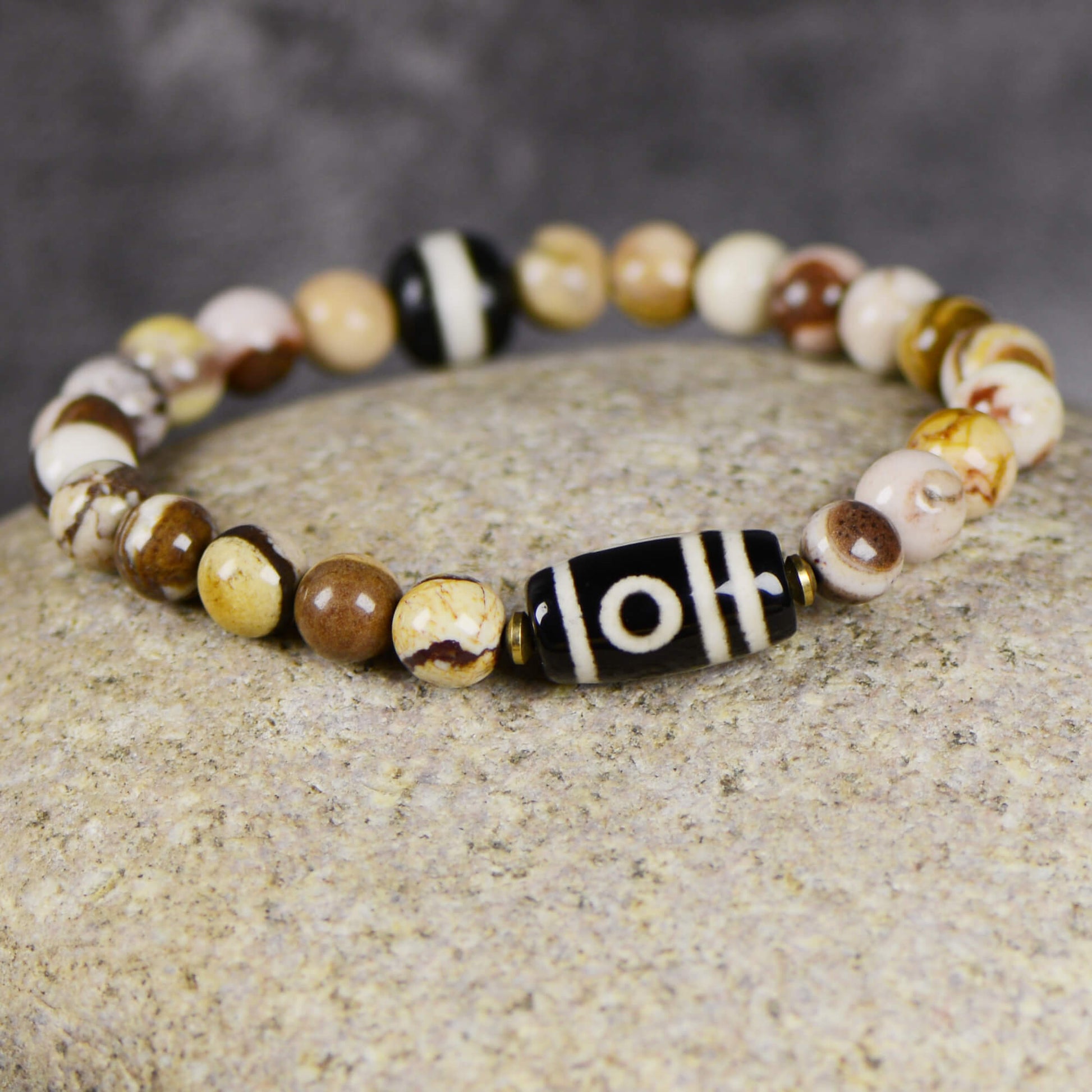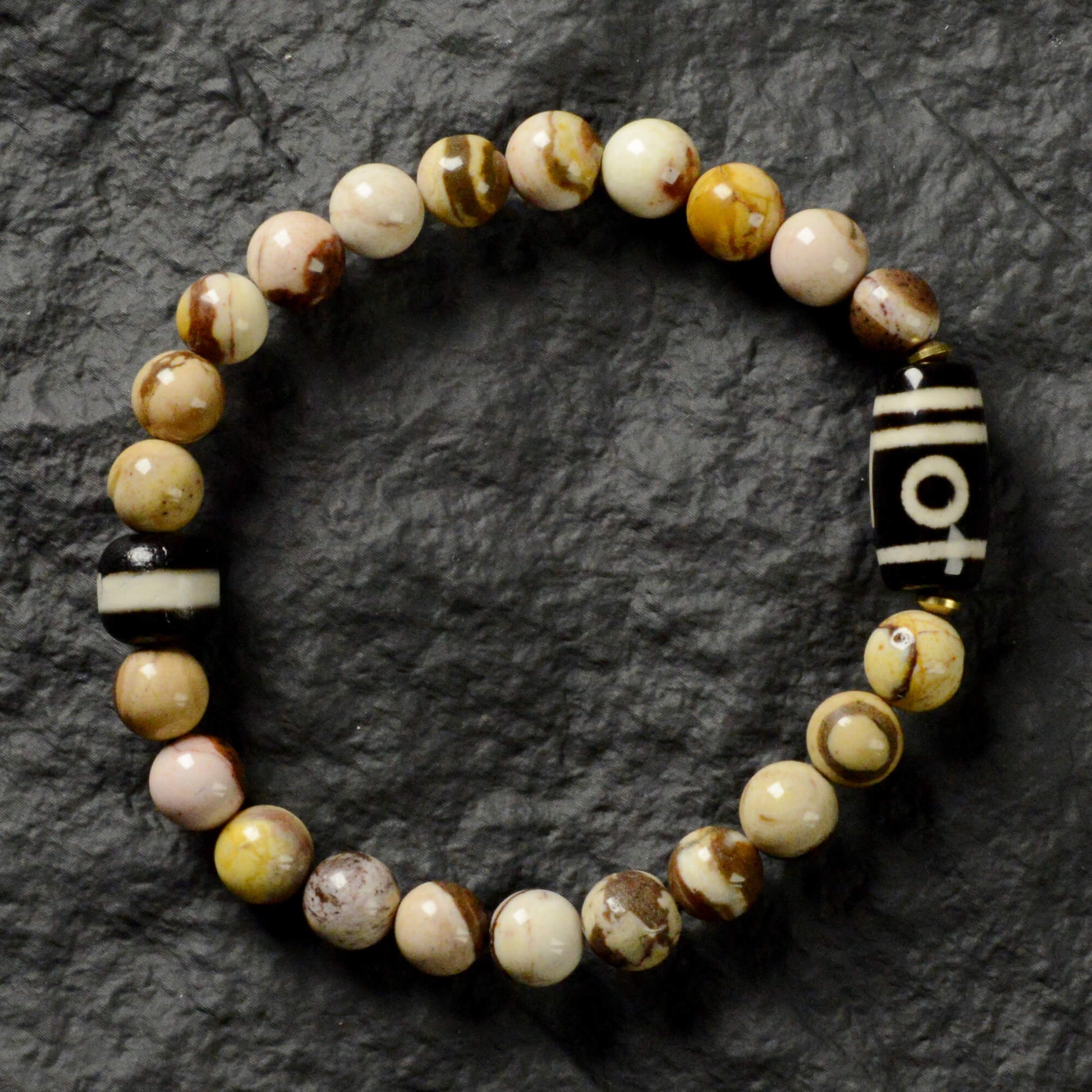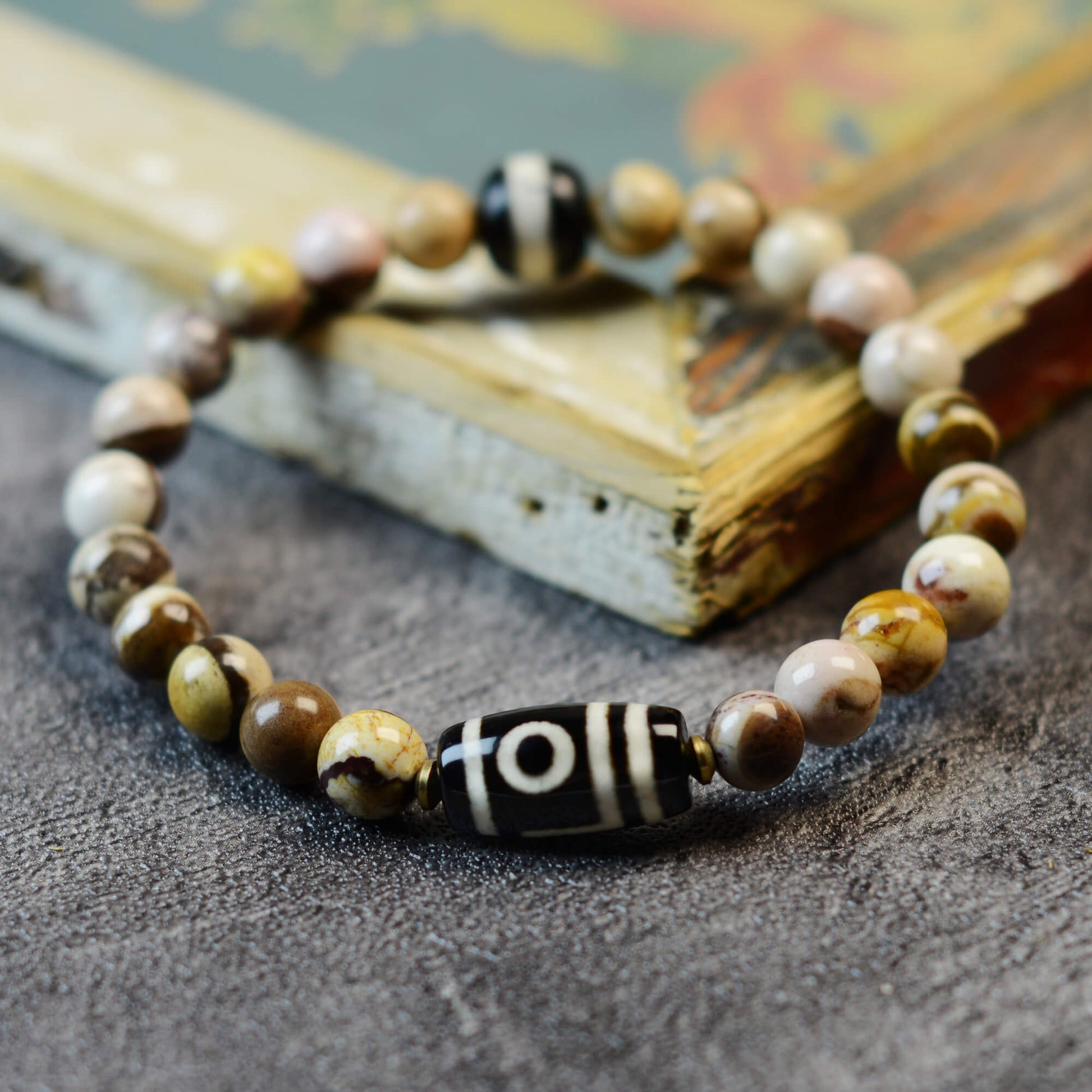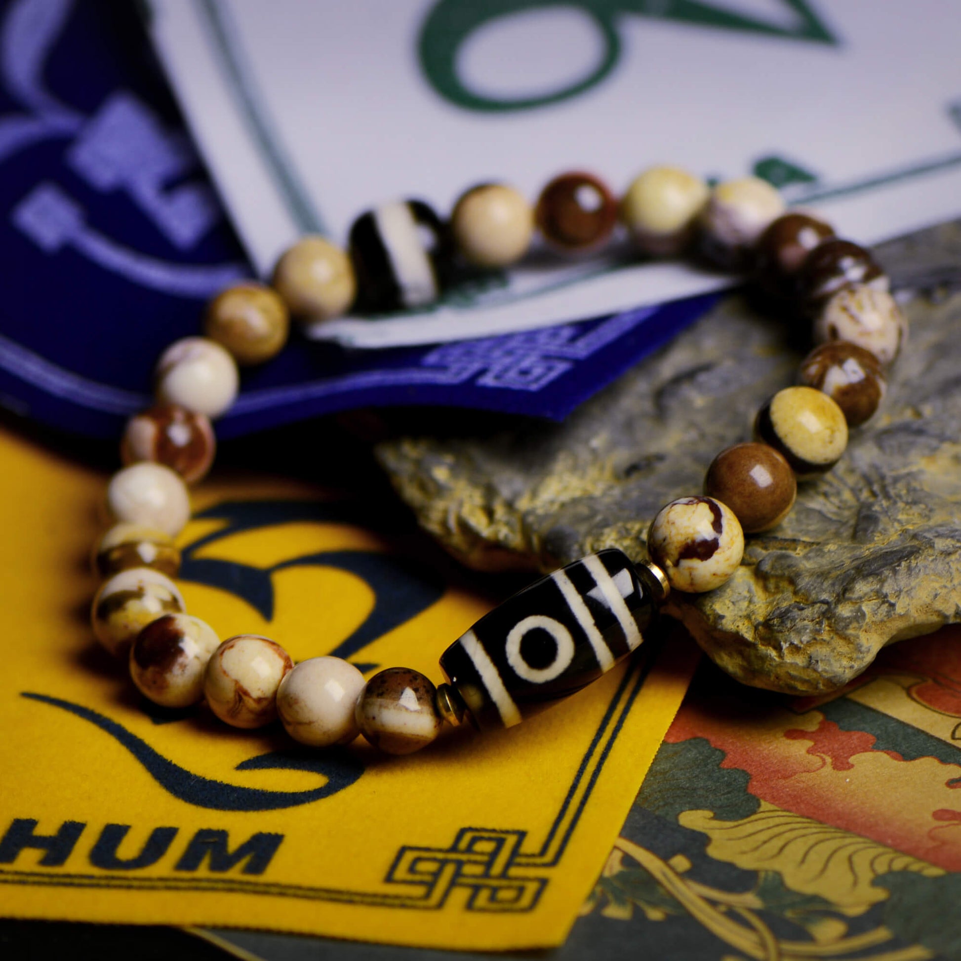 | Material | Two-Eyed Dzi Bead, Petrified Wood Beads, Single-Line Black Yakushi Bead |