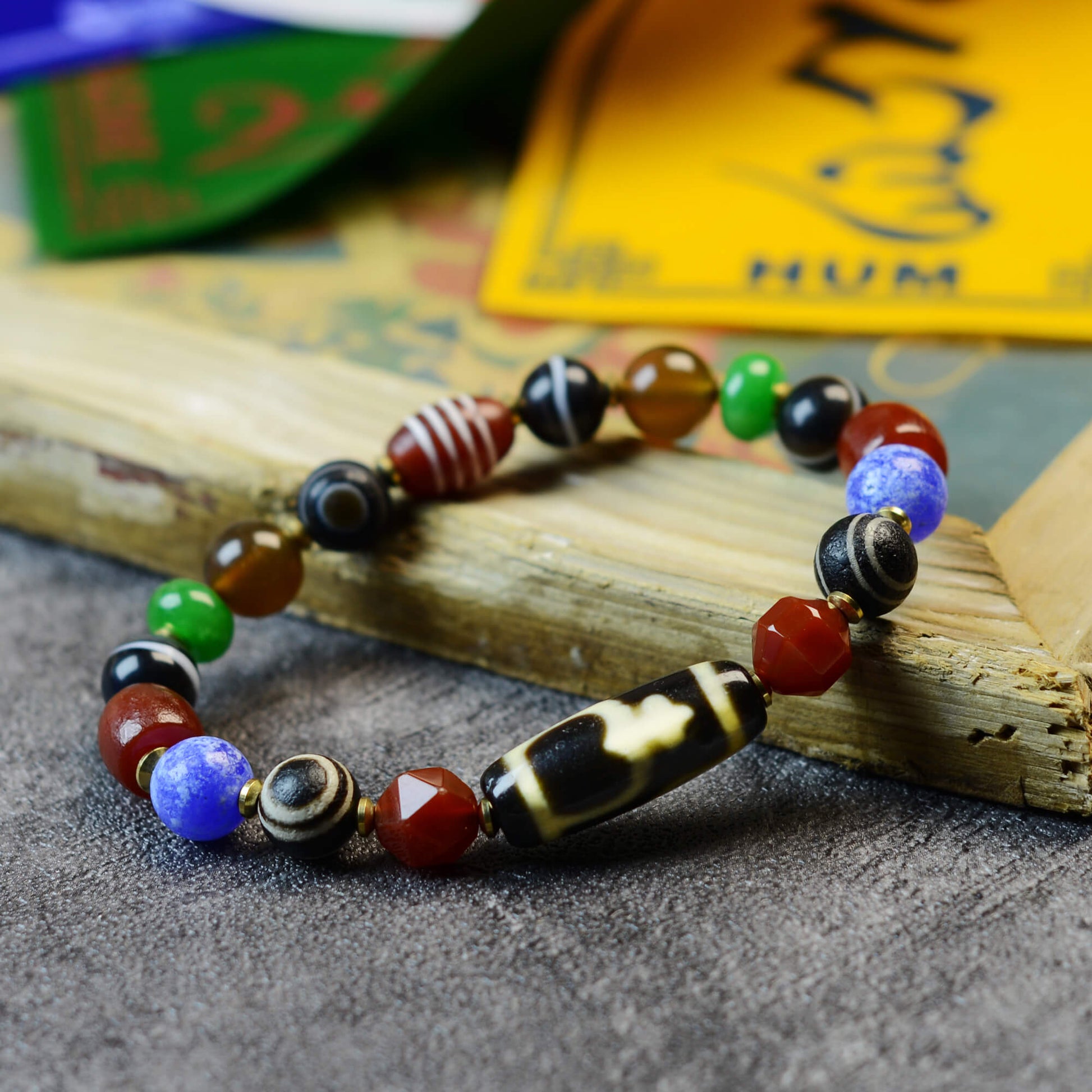 This unique One-Eyed Heaven-and-Earth Dzi is paired with multiple colorful natural agate beads, giving it a sense of mystery and distinctive character.